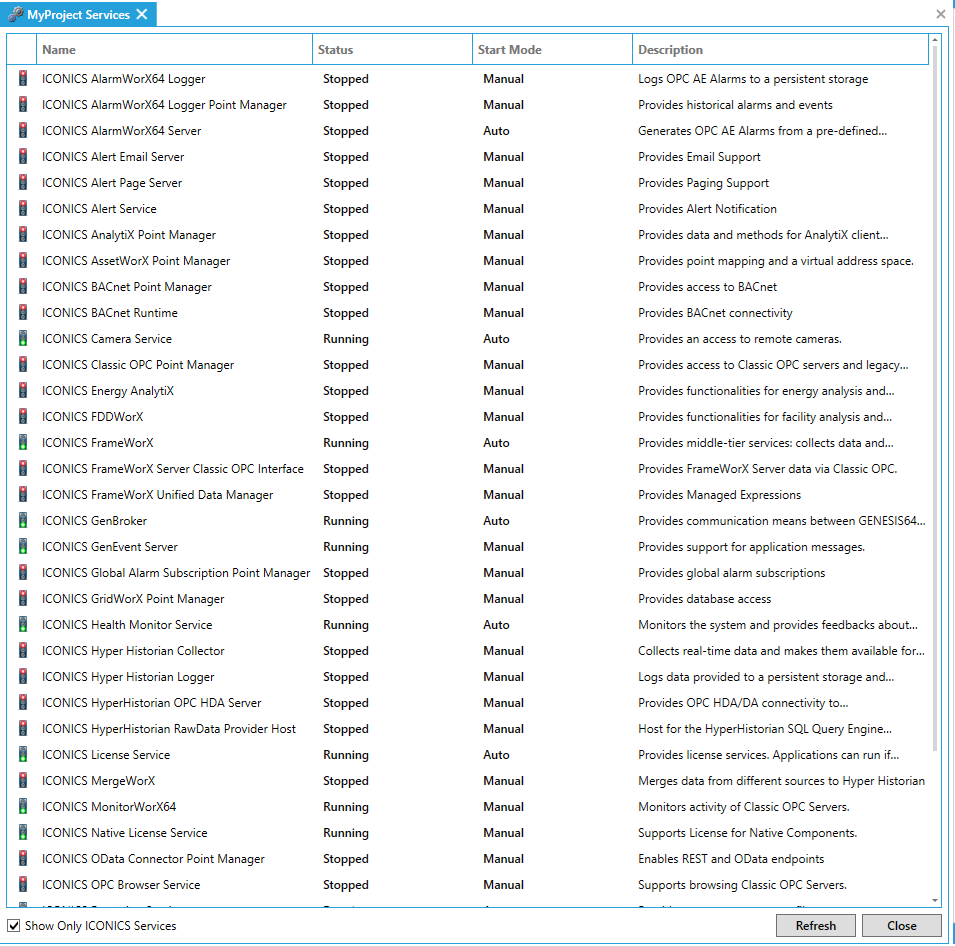 The Show Only ICONICS Services checkbox is checked by default. Unchecking the box adds additional system services to the window.