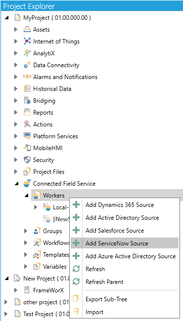 Right-click on the Workers branch, then select Add ServiceNow Source from the pulldown menu, as shown below.