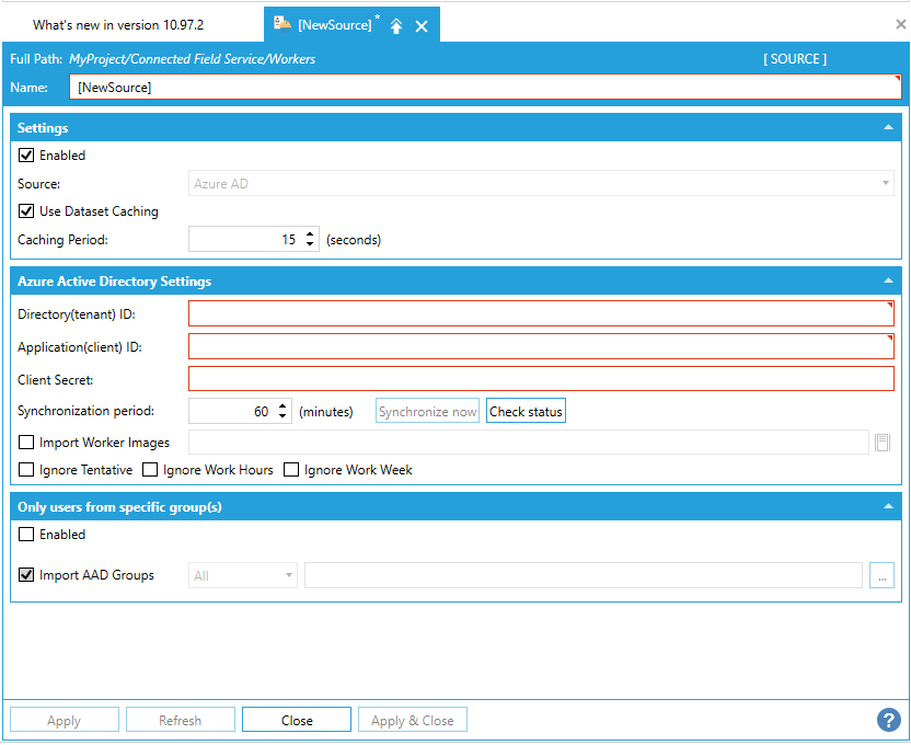 Once you have completed setting your Field Workers – Azure Active Directory Configuration properties, click on Apply, then Close to return to the Workbench.