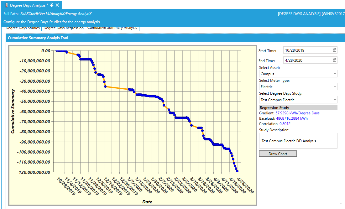The Draw Chart button will display the comparison of current energy consumption to the degree days study historical data-based regression model. The tooltip will display analytical information on how the current consumption data compare to the predicted ones using the degree days analysis study.