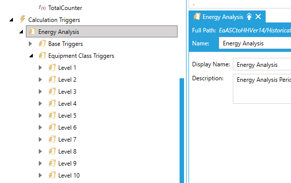 In addition, a number of pre-configured Hyper Historian calculation triggers are created to process the various energy calculations based on the AssetWorX tree level and related processing time and phases.