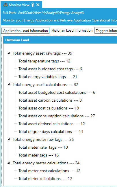 In Workbench, you can use the Energy AnalytiX provider Monitor View to get diagnostic information regarding your Energy AnalytiX application with respect to: