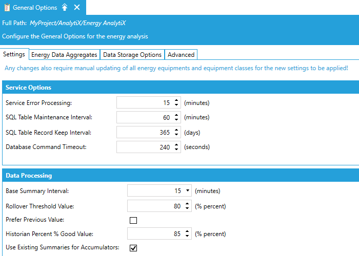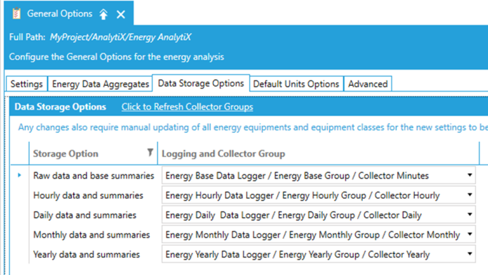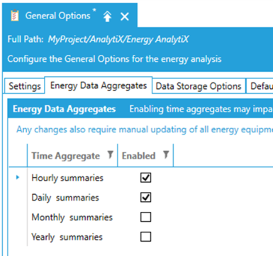 In the General Options, the end user can define data collection, data aggregates, as well as data storage options. It is recommended that the user enables only the data aggregates that are required for the specific application. Typically, Monthly and Yearly aggregates require more computational resources and time to evaluate.