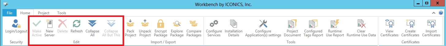 The New Server button, shown below, in the Edit section of the Home ribbon in the Workbench, allows users to add a new remote server to the project. This will also add the applications (providers) available on that server.