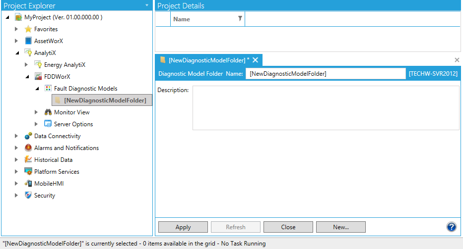 You'll notice that a placeholder branch now appears in the left-side panel of the Project Explorer, reading "[NewDiagnosticModelFolder]". Also, see that the settings for the as-yet-unnamed folder appear in the lower right panel, as shown below. Enter a name in the Diagnostic Model Folder Name field, then either click on "Apply" and proceed to make additional changes to the same Diagnostic Model Folder OR click on "Close" to save your settings and return to the Project Explorer OR click on "New..." to change the settings for an additional new Diagnostic Model Folder.