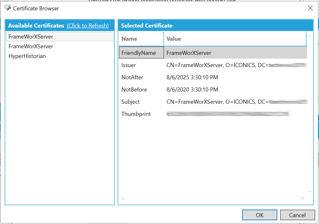 This section of the Certificate Browser window will display properties (by Name and Value) of a certificate selected in the left side of the window in the Available Certificates section. Properties include Friendly Name, Issuer, NotAfter, NotBefore, Subject, and Thumbprint.
