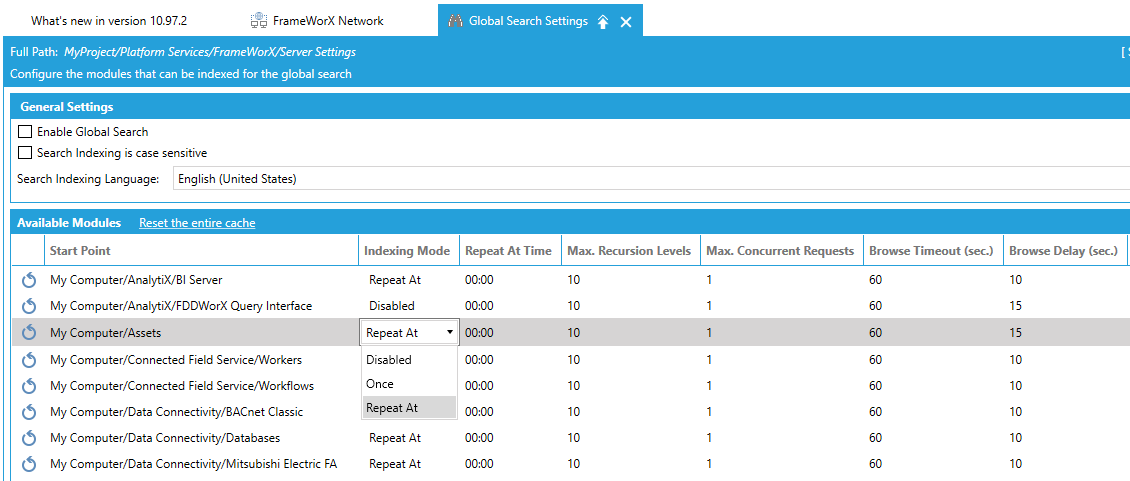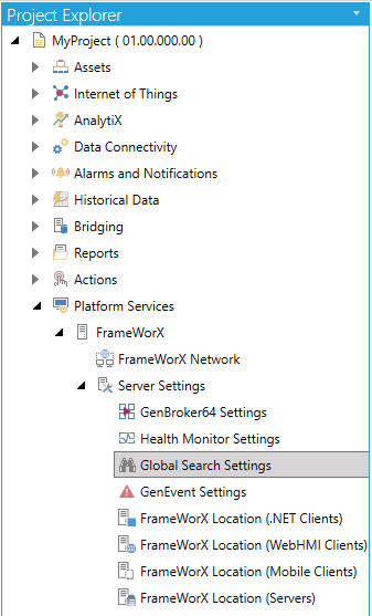 Selecting the Global Search Settings Node in the FrameWorX Provider in the Workbench