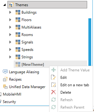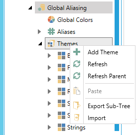 The same right-click menu also allows you to copy, cut, paste, or multiply themes theme and theme values. The Global Aliasing Server allows other users to change themes at any time, so if you want to work with the latest values, use the Refresh or the Refresh Parent commands.