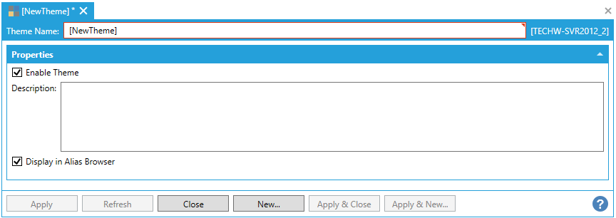 This opens the New Theme properties window in the right side of the Workbench, as shown below. Enter a Theme Name. In the Properties section, you can elect to Enable Theme by clicking on the nearby checkbox. For Description, you can opt to Display in Alias Browser and/or Use this Display Name(once this is checked, you can enter the Display Name in the now activated nearby text entry field). When you have finished making changes, click the Apply button.