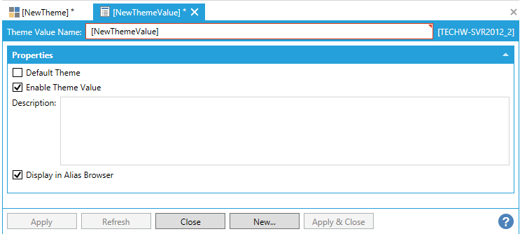 In the Properties section, note the Default Theme check box. A check mark here indicates that the alias value that gets assigned to that particular theme value will be the default value for its global alias. For most themes, you will want to identify one theme value as the default so that, during runtime, when no value is selected, the global alias resolves to a value in all instances. Tips for easily identify the default include: always choosing the first theme value as the default, or including the word DEFAULT in the theme value's name, or using some other way to make it easy to identify the default value.