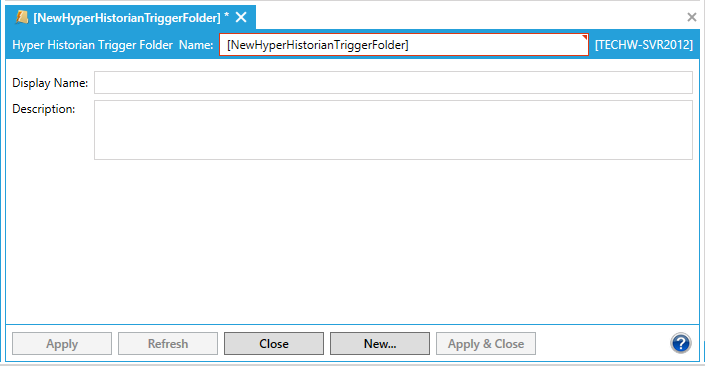 This opens the Trigger Folder properties window, shown below, beneath the Project Details section in the Workbench. Enter a name in the Hyper Historian Trigger Folder Name text entry field.