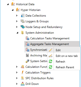 Expand the System Administration node in the navigation tree and right-click on the Aggregate Tasks Management node, as shown below, then click on Edit or Edit on a new tab.