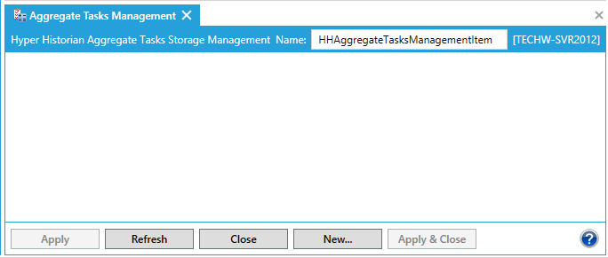 This opens the Aggregate Tasks Management properties window, shown below, beneath the Project Details section in the Workbench. Enter a name in the Hyper Historian Aggregate Tasks Storage Management Name text entry field.