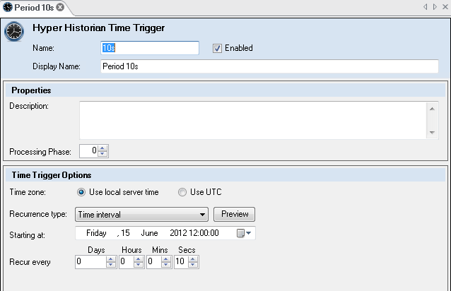 Right-click the Calculation Triggers node and select New Data Trigger. The Hyper Historian Time Trigger form opens, as shown below.