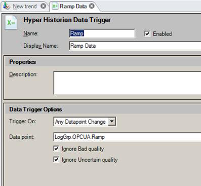 When you add a data trigger to a calculated tag, the tag's calculations fire when the value of a data point equals a specified value or condition. For example, it can fire when a machine switch gets set to on, or TRUE. A calculated tag can have any number of triggers associated with it, but a trigger must be enabled in order to fire. If it is not enabled, it won't fire.