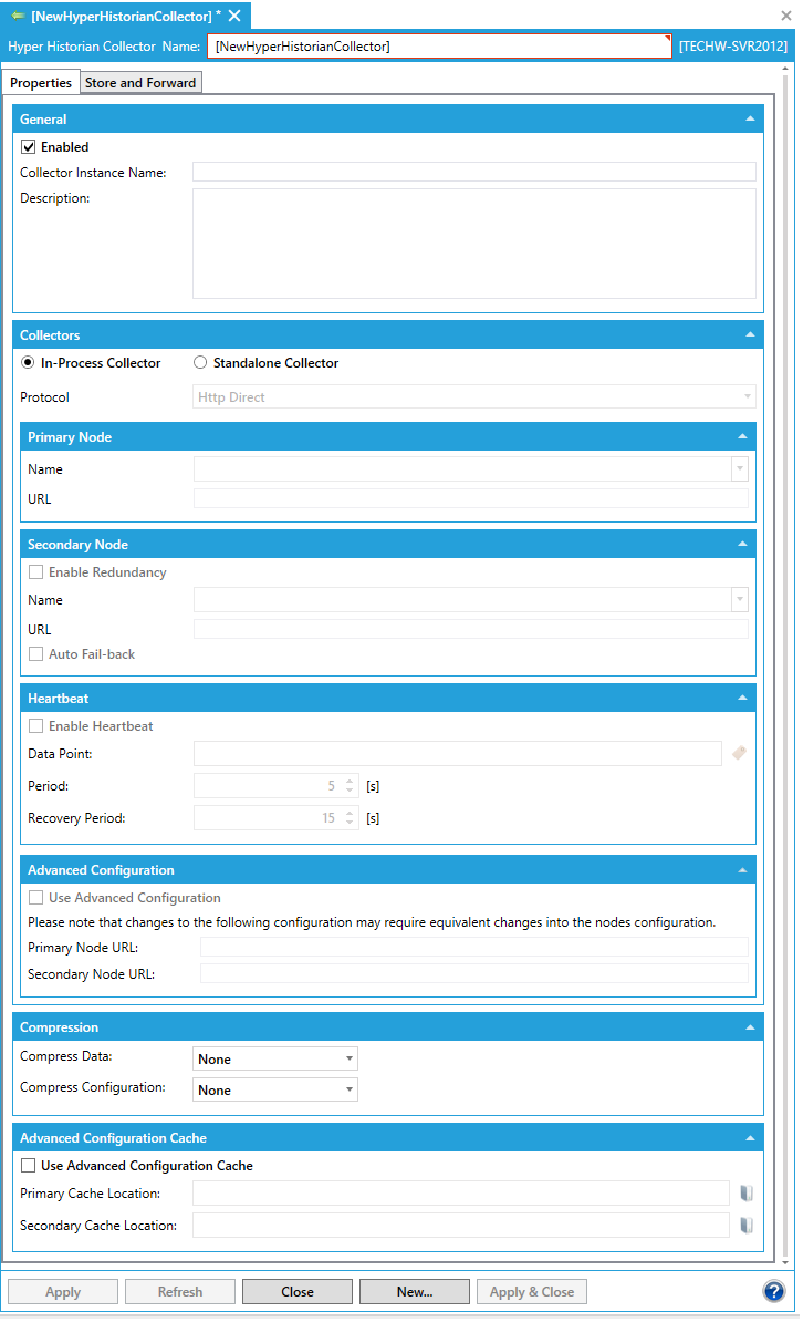Note that, alternatively, you can import collector node configuration information from an Excel spreadsheet, an XML file, or a CSV file. For more information, refer to the Importing and Exporting Hyper Historian Configurations topic. Once imported, you can edit imported information as needed.