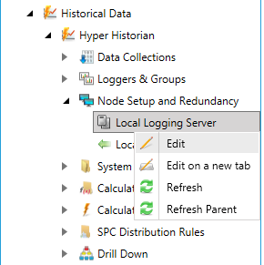 Expand the Node Setup and Redundancy node. Right-click the Local Logger Server node in the navigation tree and select EditorEdit on a new tab, as shown below.