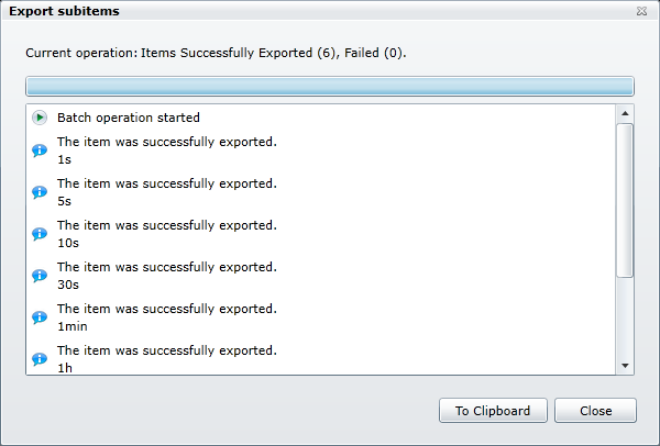 Export Items (or Export Subitems) dialog appears. This dialog tells you the export's progress and displays a message when the export is complete. After clicking the Close button, a message appears indicating the location where the file was saved and the file name itself. You can click the file path to open the file and make sure that it contains the information you wished to export.