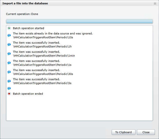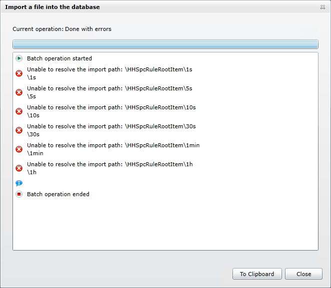 A dialog box tells you the import's progress and gives you a message when the import is complete. Below are examples of a two imports: one that was successful, and another in which the user tried to import a file of System Setting into an incompatible file of Hyper Historian tags.