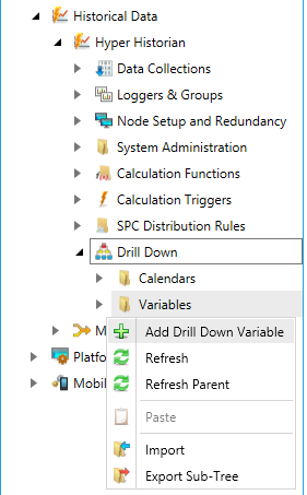 Expand the Drill Down node to show the Variables node. Then, right-click the Variables node in the navigation tree and select Add Drill Down Variable, as shown in the figure below.