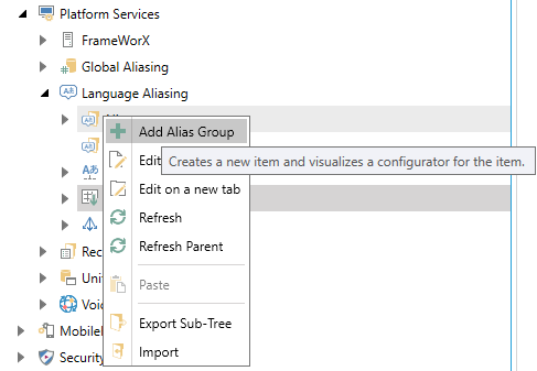Right-click on Aliases within the Language Aliasing node, then click on Add Alias, as shown below.