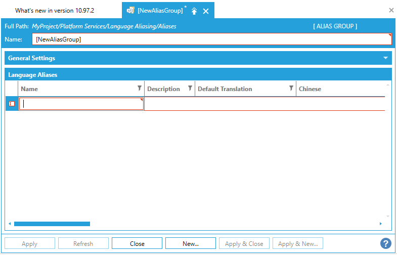 From the Workbench, expand your Project in the Tree Explorer, then expand Platform Services. You'll see the Language Aliasing node of the Tree Explorer. The screen consists of a split window with a tree control in the left-hand pane and the configurator in the right-hand pane.