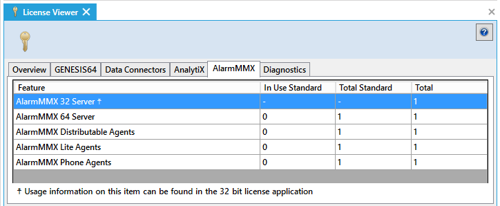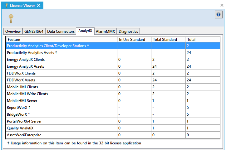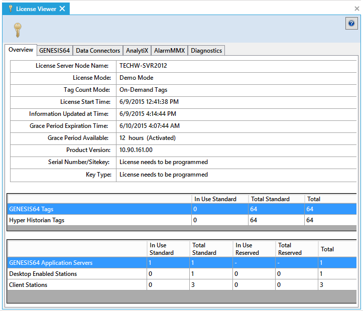 The License Viewer will appear beneath the Project Details section of the Workbench. Each of the License Monitor tabs (Overview, GENESIS64, Data Connectors, AnalytiX, AlarmWorX Multimedia, and Diagnostics) is illustrated and described below. For additional help using this tool, refer to Reviewing Your Licensing, below.