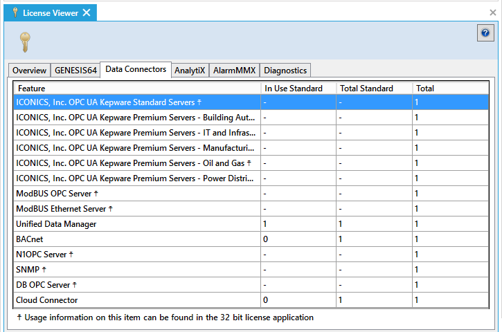 HyperHistorian Tags: The In Use Standard column shows the number of standard I/O points (that is, OPC tags) that are currently logging data through HyperHistorian on the server. The Total Standard column shows the number of HyperHistorian tags that the standard license allows for. And the Total column shows the total number allowed for this use per the ICONICS license agreement.