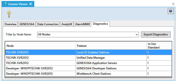 To see the machines where a GENESIS64 feature is in use, use the Diagnostics tab.