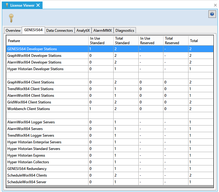 The In Use Standard column displays the number of standard license workstations where the GENESIS64 feature is currently running. The Total Standard column displays the number of standard license workstations that can run the feature in accordance with the license. The In Use Reserved column shows the number of reserved user licensed workstations where the product is currently running as an application. The Total Reserved column shows the number of reserved user licensed workstations that the reserved user license allows for the same purpose (See Reserved User License). The Total column displays the number of workstations that can run the feature per the ICONICS license agreement. Note that the 'In Use' and 'Total' columns contain counts that were current at the time displayed in the Information Updated at Time field on the Overview tab; it is possible that connections have been added or removed since then.