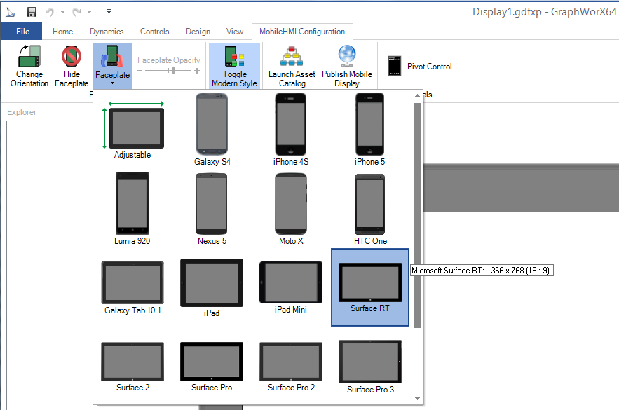 Select the Faceplate icon to change the faceplate shown around the edge of the display in GraphWorX64. The pulldown shows a variety of mobile device options. Hover over any selected mobile device option to see a tooltip containing the device name, pixel resolution and display ratio, as shown below.