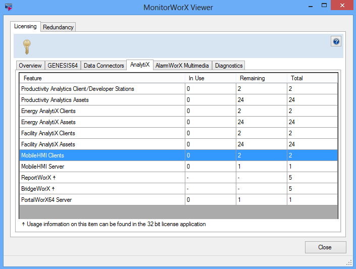 MobileHMI Clients are counted in the same way as GraphWorX64 clients. (For more information about ICONICS Licensing, click HERE.) To view the number of clients you have, go to the MonitorWorX Viewer. Select the Licensing tab, and then the AnalytiX tab before selecting the MobileHMI Clients category from the list displayed below.