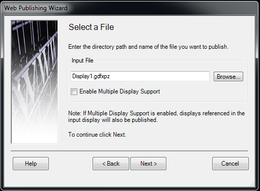- The Select a File dialog box appears. The Input File field defaults to the current file. You may decide to enable (check) or disable (uncheck) the Enable Multiple Display Support checkbox. This option allows you to include linked displays (through load display pick actions or buttons) to the batch of publishing. Click Next.