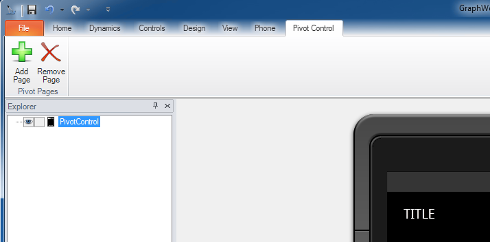 - Use your cursor to drag an outline of a Pivot Control onto your screen. The word "TITLE" appears on the upper left part of the screen and a new tab in the Ribbon appears entitled Pivot Control and gives you the option to Add or Remove pages.