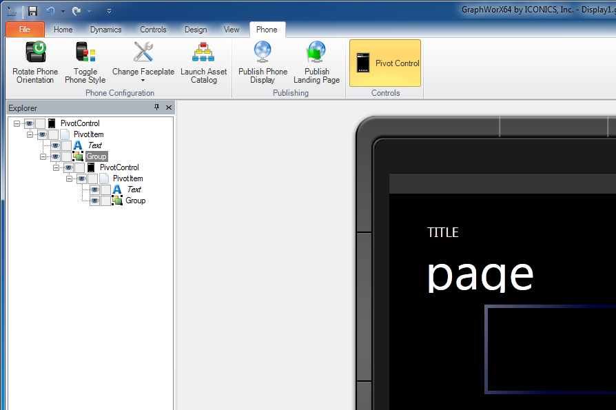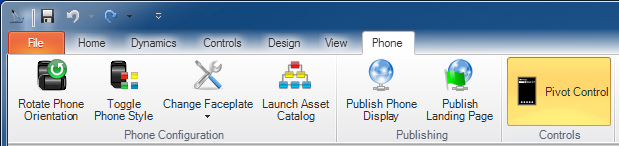- On your computer, open GraphWorX64 for MobileHMI through the Start Menu > All Programs > ICONICS > MobileHMI or open a new display in GraphWorX64. Select the MobileHMI Configurationtab and click the Pivot Control icon.