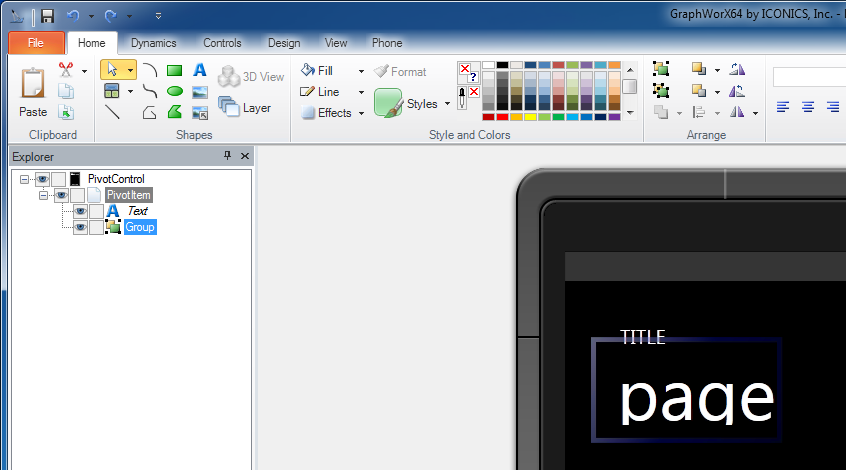 - The word "page" beneath "TITLE" acts as a place holder. Modify this page to create your Pivot Control. Each Pivot Control item or page contains a GraphWorX64 canvas and therefore allows you to draw objects within the bounds of the screen.