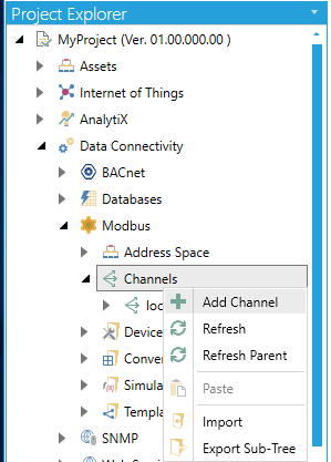 From the Project Explorer, click on Channels, then Add Channel, as shown below.