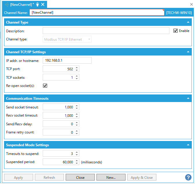 Configuring a New Channel [Modbus TCP/IP Ethernet Channel Type Selected]