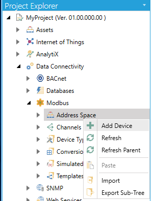 From the Project Explorer, click on Address Space, then Add Device, as shown below.