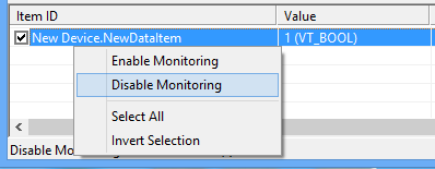 Monitoring is enabled for each item with a check mark next to it. To enable/disable monitoring for an item, you can click on the box to the left of the item. A check mark inside the box means the item is enabled for monitoring. If there is no check mark, then the item is disabled. To disable monitoring for a checked item in the monitor view, you can also right-click on the item and select Disable Monitoring from the pop-up menu, as shown in the figure below.