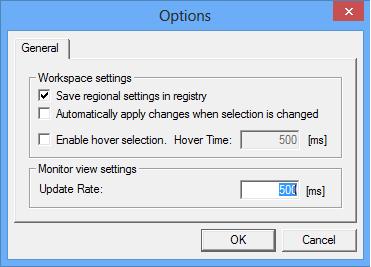 To set the OPC Monitoring Update Rate (in milliseconds), select Options from the Tools menu and click on the General tab of the Options dialog box, as shown in the figure below.