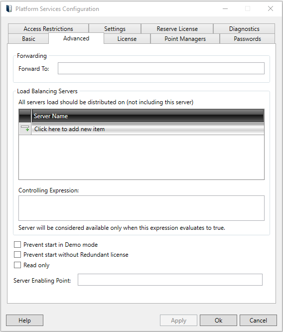 When an expression is entered in this text entry field (and any current changes to Platform Services Configuration are applied), the server will be considered available only when the entered expression evaluates to True.