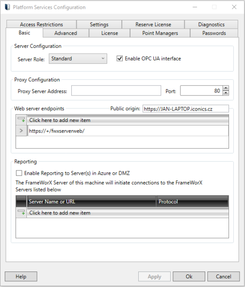 The Platform Services Configuration dialog box opens, and looks something like the following. The following options can be set through the Basic tab.