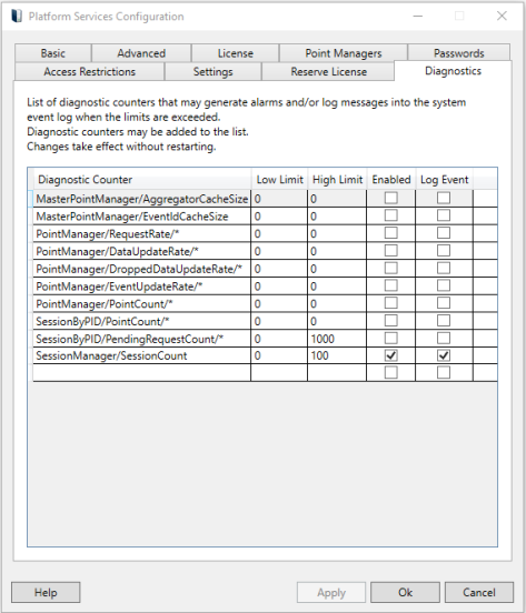 The Diagnostics tab allows you to set properties for Diagnostic Counters. These Diagnostic Counters may generate alarms and/or log messages into the system log when their limits are exceeded. You can set a Low Limit or High Limit for any selected Diagnostic Counter and can add Diagnostic Counters by typing within the empty text entry field at the bottom of the list.