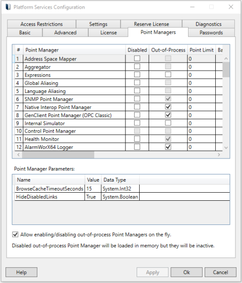 The Point Managers tab of the Platform Services Configuration window allows you to Disable/Enable and/or set "Out-of-Process" status and other parameters for specific Point Managers for multiple integrated data components (aggregators, aliases, data connectors, databases, histories, etc). Point Managers are plug-in modules running within the process of a FrameWorX Server. They may be disabled when their functionality is not needed, in order to minimize the FrameWorX Server’s memory footprint or for troubleshooting. Also, they may be set up to run out-of-process. Then, they run in a separate process but there is a slight performance hit when running out-of-process.