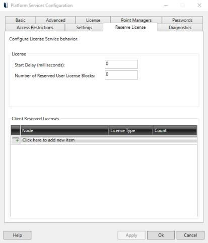 The bottom Client Reserved Licenses section allows users to pre-allocate license types to a specific node. Enter a Node and then select a specific License Type and then enter a number in the Count column for the number of pre-allocated licenses to reserve for that node (in most cases, the Count number will be 1.
