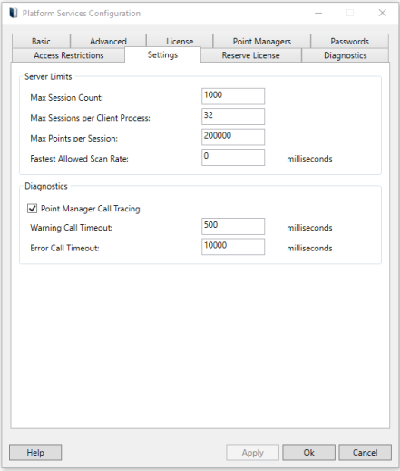 - Max Points per Session - Limits the number of all points per session. The points include data points, security points, licensing, alarm subscriptions, etc. NOTE: Some points (security, licensing) are ‘invisible’, so the limit should be greater than the expected number of data points.