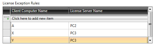 The License Exception Rules section allows users to redirect licensing to another server for specified client computers. In the example shown below, all clients connected to this FrameWorX Server get a local license. Client A gets license from PC2. Clients X and Y get their license from PC3.