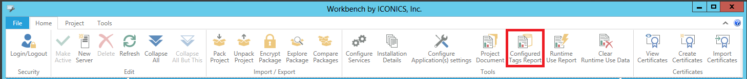 Configured Tags Report Button in the Tools Section of the Home Ribbon in the Workbench
