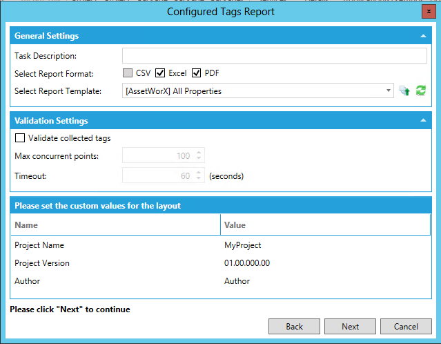 General Settings/Validation Settings/Layout Custom Values Section of the Configured Tag Report Wizard